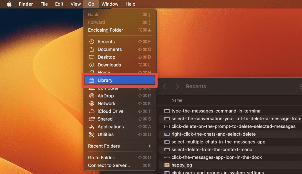 - 當持有選項 ⌥關鍵,圖書館文件夾出現在菜單中。單擊它可打開“庫”文件夾。