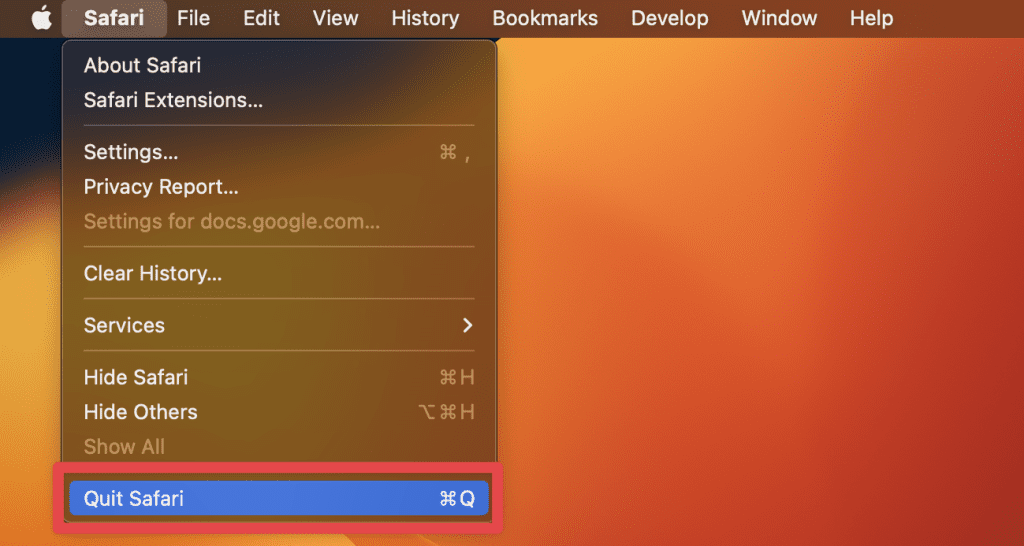 - 確保 Safari 未運行。如果是,請右鍵單擊 Dock 中的 Safari 圖標並選擇退出應用程序辭職或去Safari > 退出 Safari在菜單欄中。