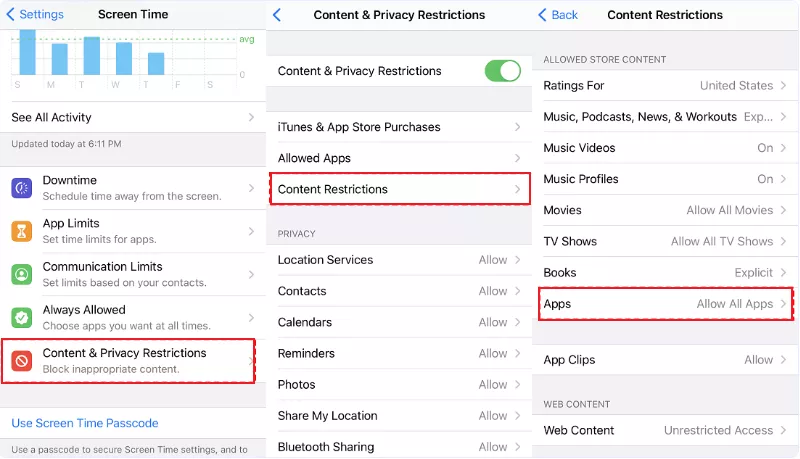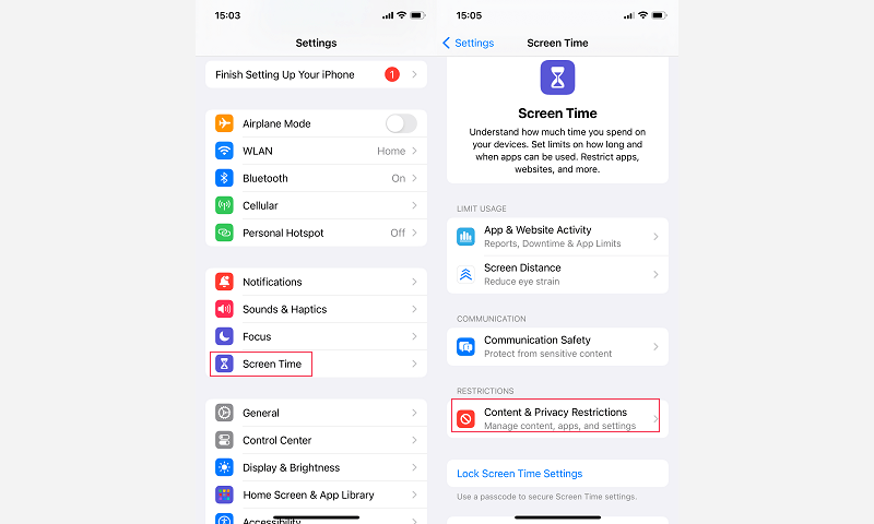 步驟一:前往設定>屏幕時間>內容和隱私限制。如果出現提示,請輸入您的屏幕時間密碼。