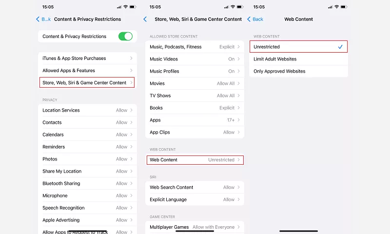 步驟2:輕敲商店、網絡、Siri 和遊戲中心內容>網頁內容>無限制。