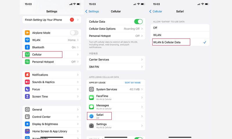 設置新 iPhone 時,很容易錯誤地限制 Safari 對蜂窩數據和 WLAN 的訪問。這可能會導致 Safari 無法連接到互聯網。要解決此問題: