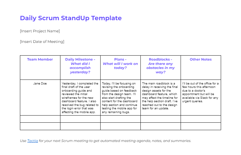 該模板應包括三個關鍵問題:我昨天完成了什麼?我今天要做什麼?我的路上有什麼障礙嗎?這是保持溝通清晰並確保責任的簡單方法。免費訪問 Taactiq每日 Scrum 會議 Google 文檔和Word模板以便更輕鬆地參考團隊成員的進度。