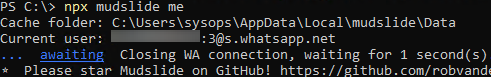 計算機上的 Mudslide 客戶端應作為您帳戶中的第二個 WhatsApp 客戶端進行身份驗證,才能發送 WhatsApp 消息。運行命令: