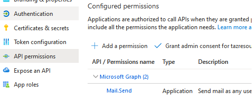 - 配置使用 Microsoft Graph API 發送電子郵件的權限