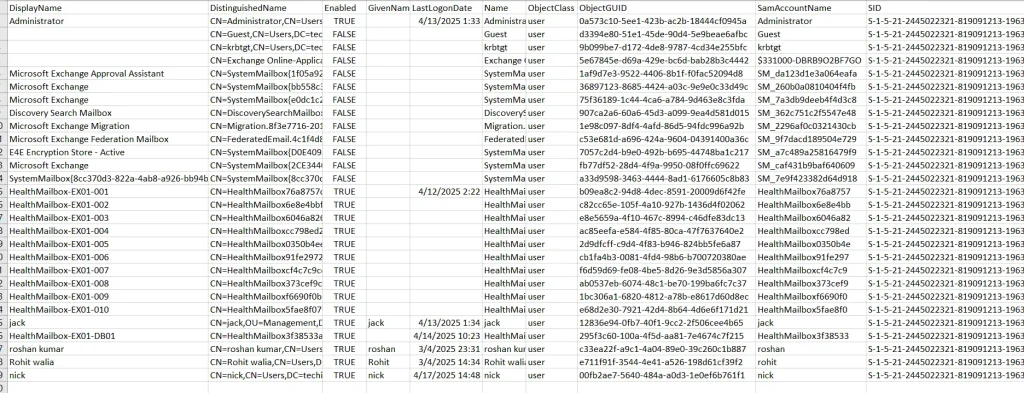 $Users = Get-ADUser -Filter * -Property SamAccountName, DisplayName, Enabled, LastLogonDate