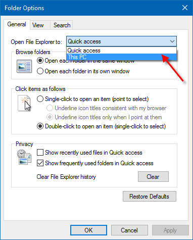 步驟 3:在一般的選項卡,選擇這台電腦在打開文件資源管理器下拉菜單,然後單擊好的。