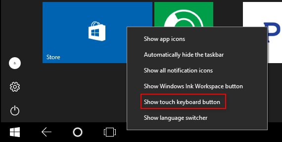 右鍵單擊任務欄,然後單擊顯示觸摸鍵盤按鈕使其顯示(選中)或隱藏(未選中)。