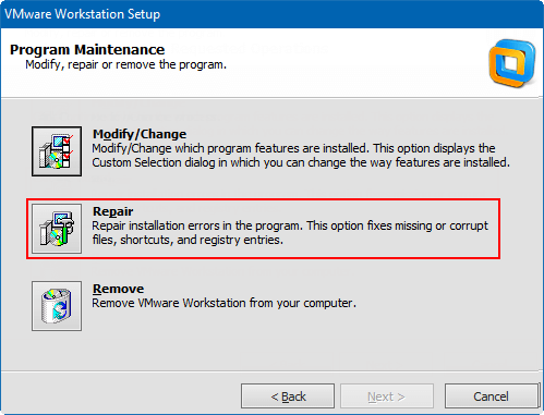 如果您的 VMware Workstation 表現出異常行為,例如 VMware Authorization Service 未工作或正在運行,您可以執行修復升級來解決問題。修復升級是使用安裝包文件在硬盤上的現有 Workstation 上安裝 VMware Workstation 的過程。