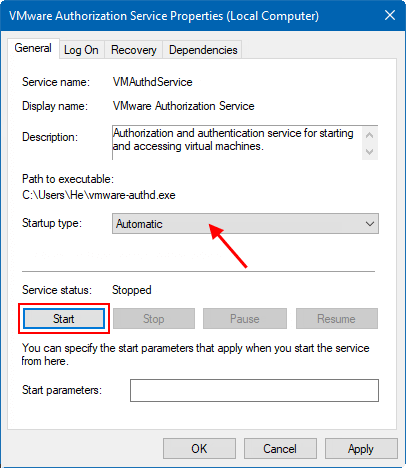 4. 在啟動類型字段中,選擇自動。然後單擊開始按鈕來運行服務。