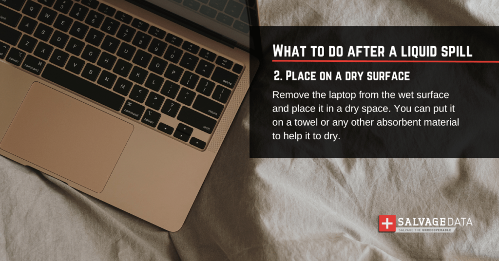 為防止進一步損壞,請將筆記本電腦放在乾淨乾燥的表面上。將其放在毛巾、紙巾或其他吸收材料上,以吸收筆記本電腦內部可能存在的一些液體。這將消除多餘的水分,幫助您更快地干燥設備。