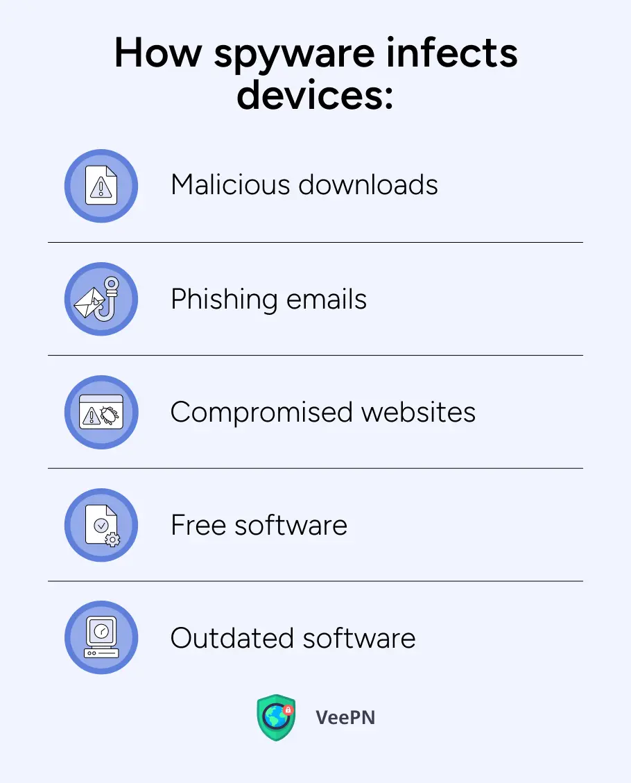 間諜軟件是由黑客或其他惡意代理製作的受感染計算機程序,用於在用戶不同意甚至不知道其存在的情況下從用戶設備收集數據。它可以通過多種渠道滲透您的設備: