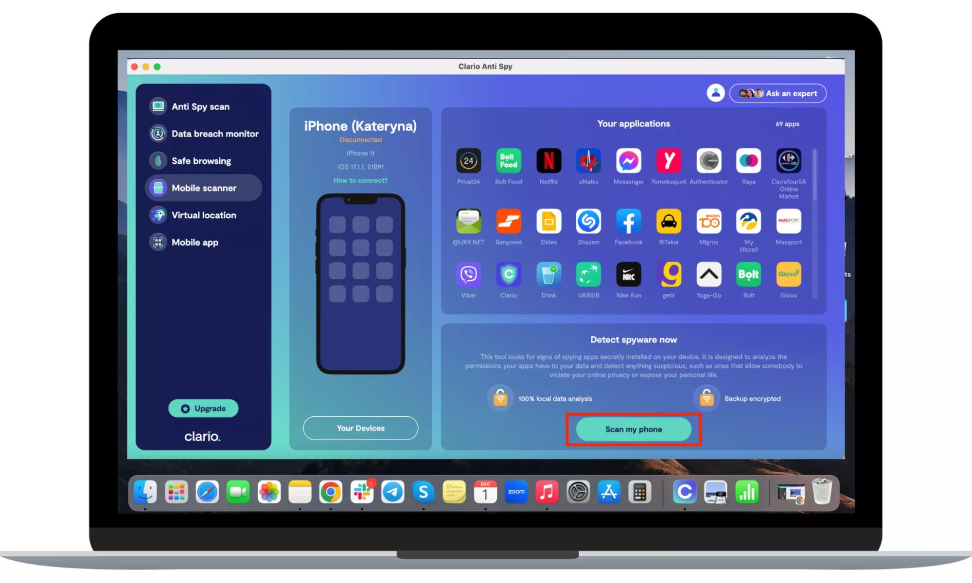 - 運行網絡安全應用程序:諸如Clario Anti Spy之類的知名安全應用程序將擁有許多檢測和刪除惡意軟件和其他威脅的工具。我們的綜合安全解決方案具有間諜軟件掃描,並刪除應用程序跟踪您以保護設備,聊天和在線帳戶。