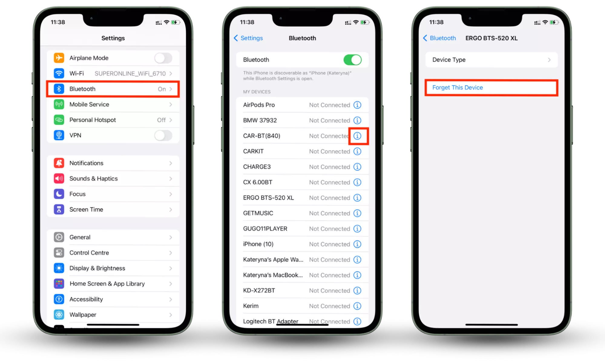 步驟1-3:打開設置>點擊藍牙>查看您的設備。點擊我按鈕>忘記此設備。