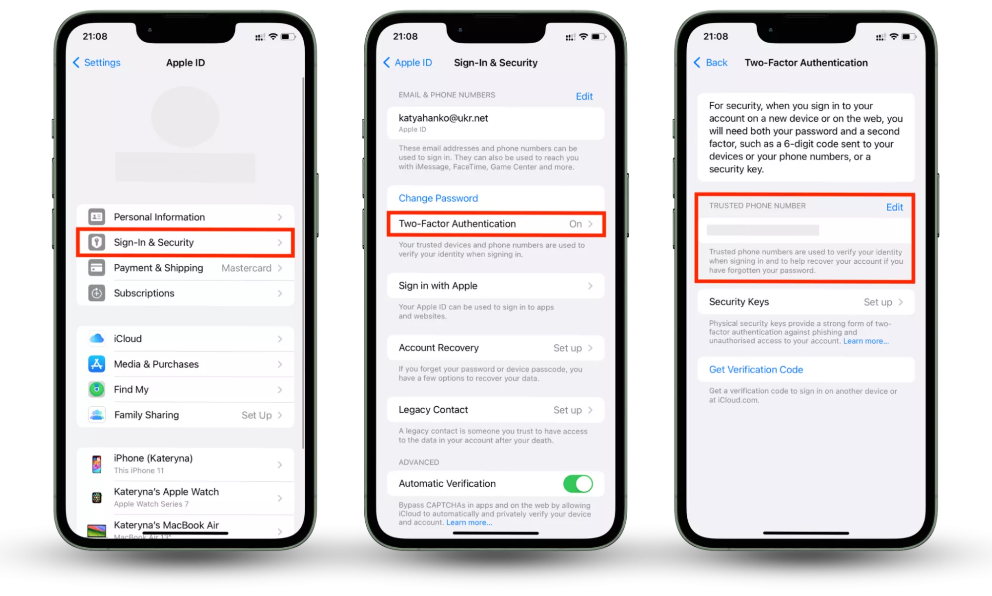 步驟1-2:打開設置>點擊[您的名字]>登錄和安全性。打開兩因素身份驗證。