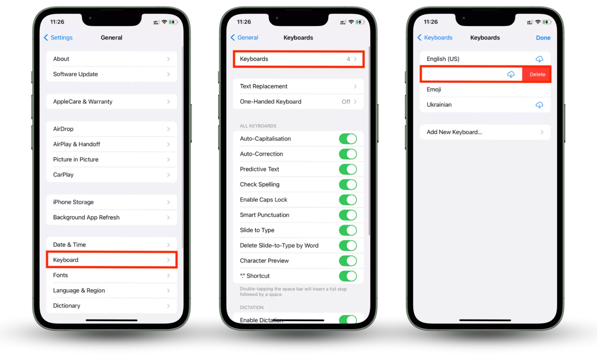 步驟1-3:打開設置>常規>鍵盤。點擊鍵盤>在iPhone上查看鍵盤。向左滑動並刪除。