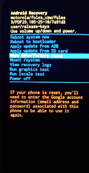 - 使用音量按鈕選擇擦除數據/恢復出廠設置,然後使用電源按鈕確認。