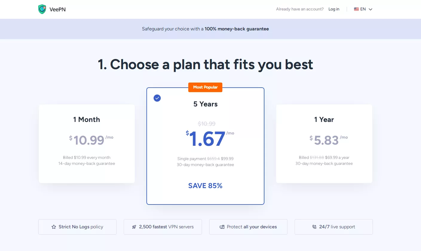 您可以選擇 1 個月、1 年和 5 年計劃,後者提供最佳報價,並且每個計劃都提供退款保證。您還可以免費試用 VeePN。