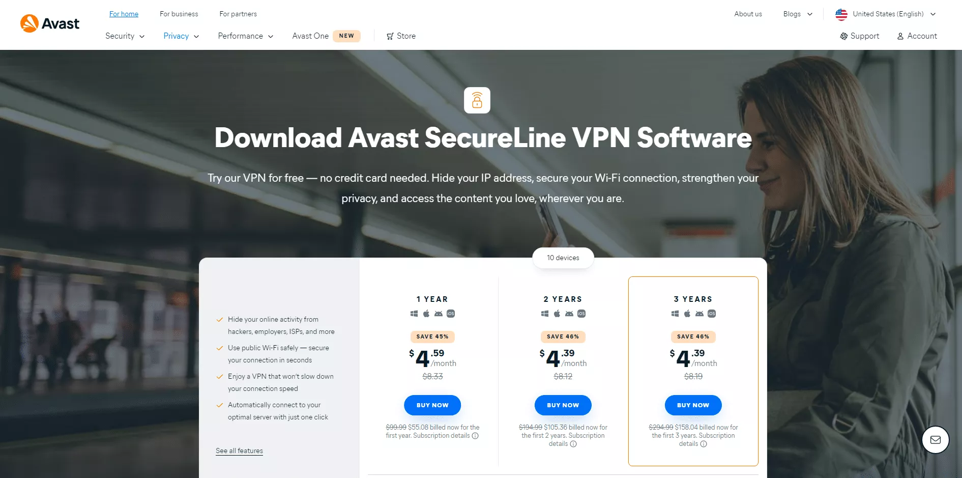 您可以與 Avast 建立更多同步連接 — 同時在最多 10 台設備上安全地瀏覽和流式傳輸。此外,與所有 Avast 產品一樣,該服務使用良好的安全標準。您還可以將其與 Avast Antivirus 配對,最大限度地提高您的安全性,同時抵禦病毒並保護您的數據。