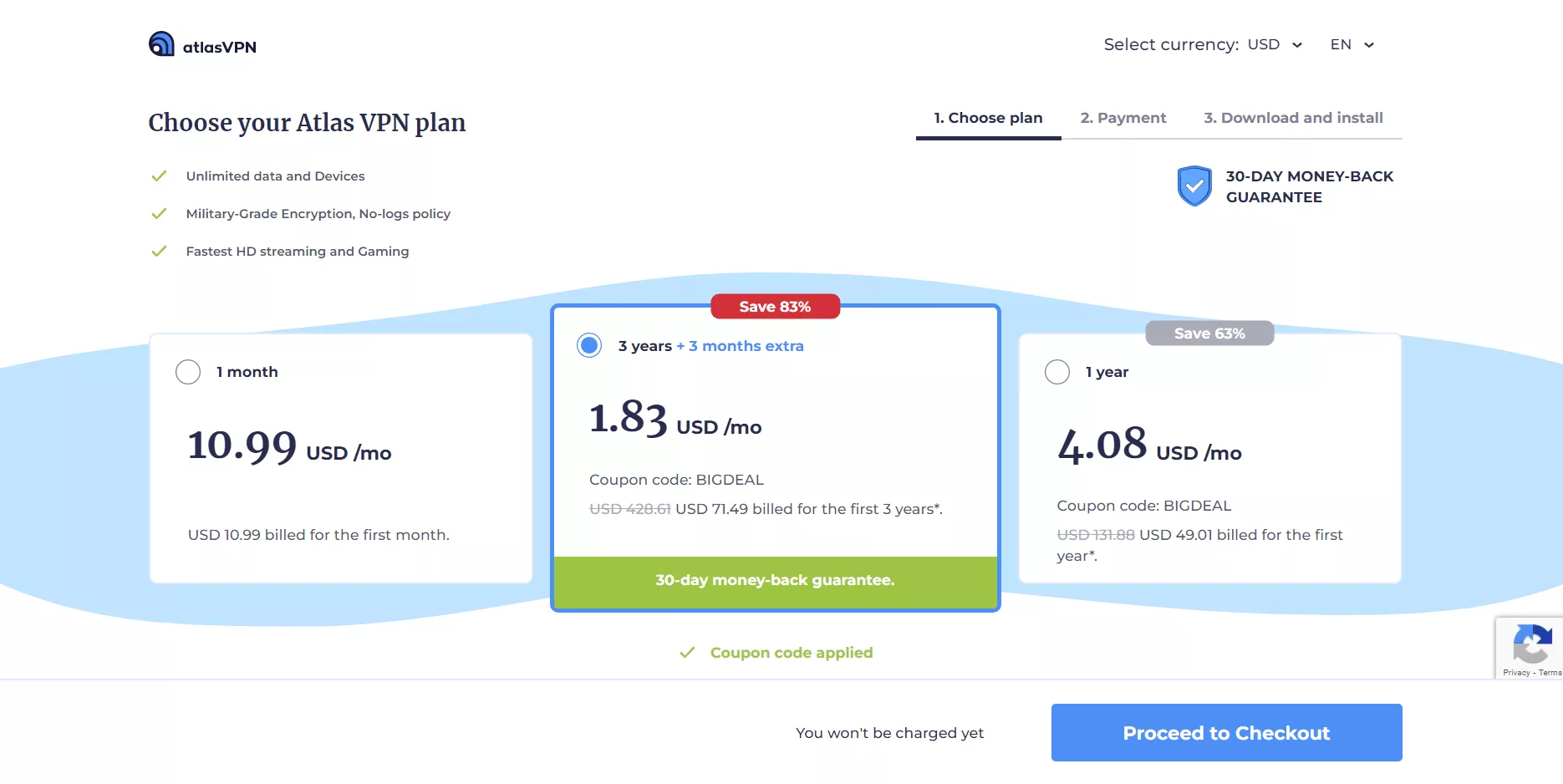 如果免費版本不適合您,您可以在 Atlas VPN 的三個訂閱選項中進行選擇,每個選項的價格都很有吸引力。所有計劃都具有相同的功能和30 天退款保證以及。