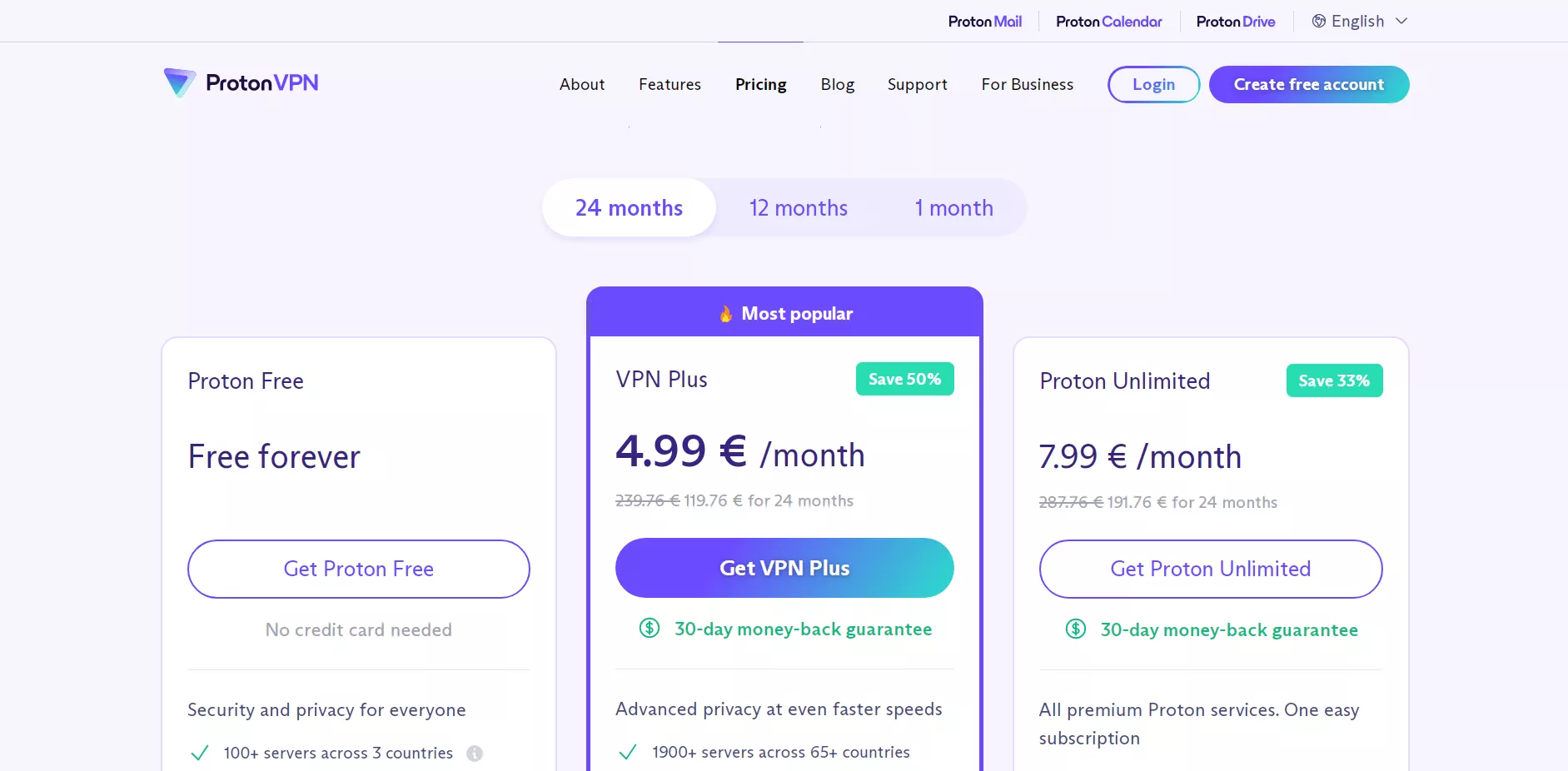 Proton 提供免費和付費版本。產品的最佳報價是plus 計劃 8 美元/月。它提供廣泛的服務器網絡、10 個並發連接、最高的速度和關鍵的安全功能,例如網盾、安全核心 VPN,以及其他。您還有 30 天退款保證。仔細看看下面每個計劃的特點。