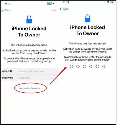 在最新版本的 iOS 中,您將看到激活鎖屏幕,其中顯示“使用密碼解鎖”選項,如下所示。