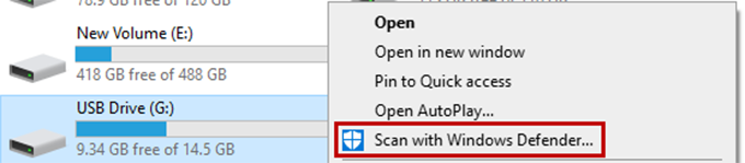 按勝利+E熱鍵打開Windows資源管理器,右鍵單擊寫保護的USB磁盤,然後選擇使用 Windows Defender 掃描從上下文菜單中。然後,系統將開始檢測。