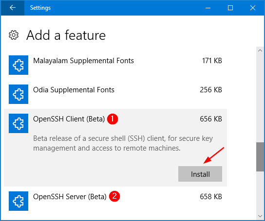 瀏覽功能列表並查找OpenSSH 客戶端或者OpenSSH服務器特徵。選擇OpenSSH Client或OpenSSH Server後,您可以單擊安裝按鈕。