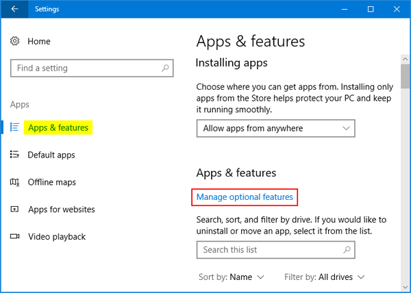 當應用程序和功能出現頁面,點擊“管理可選功能” 右側窗格中的選項。