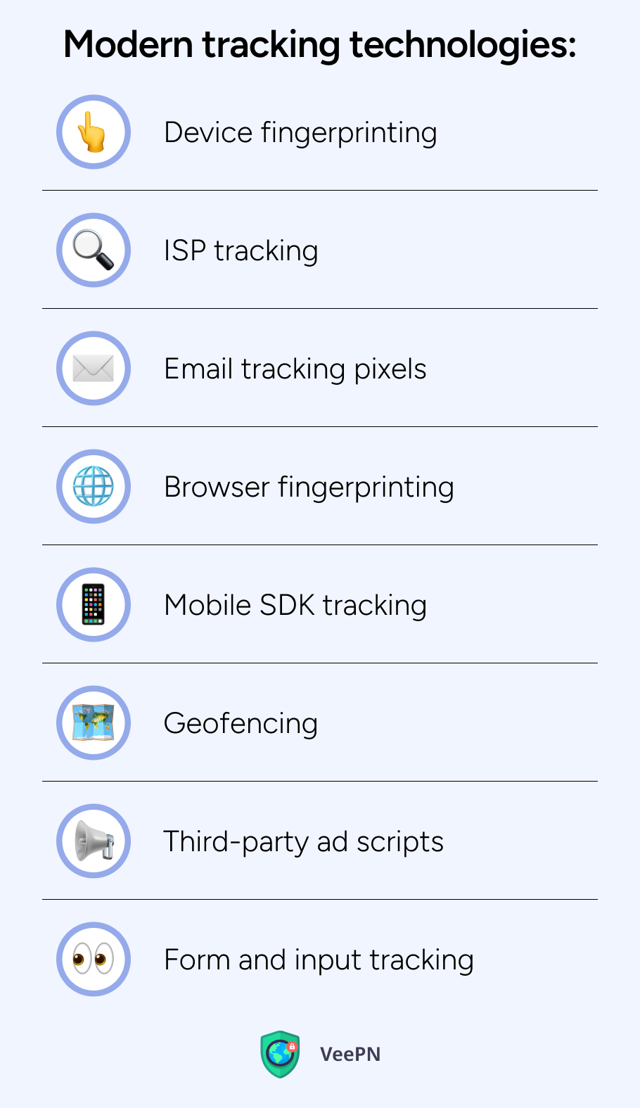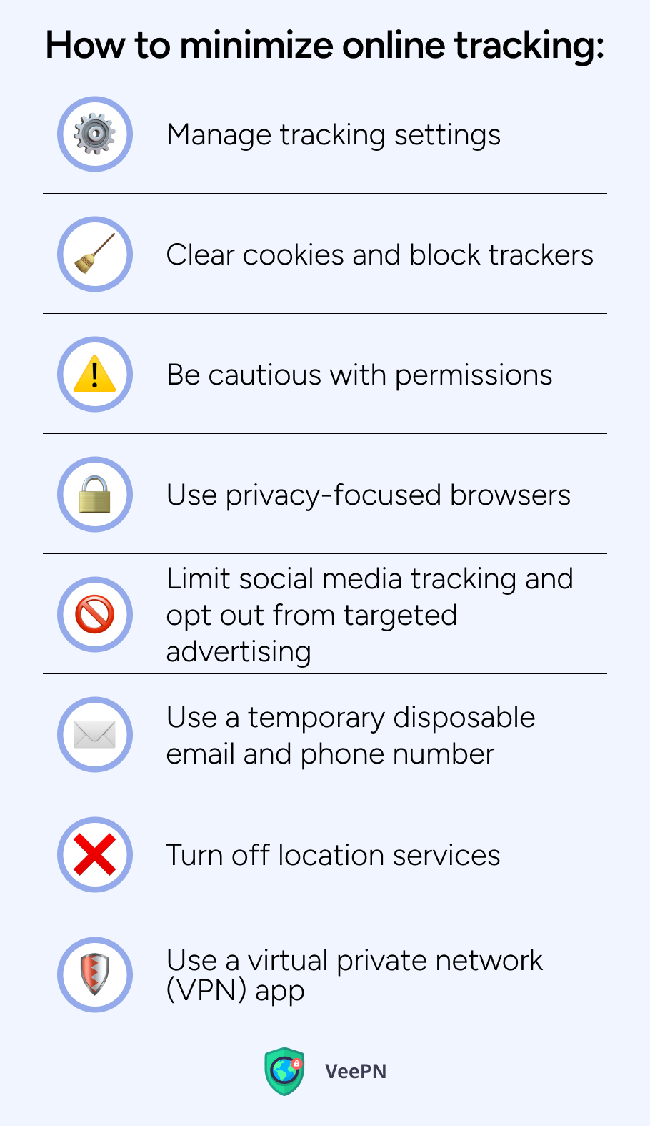 使用可靠的 VPN(例如 VeePN)、阻止第三方 cookie、調整應用程序權限並以私密模式瀏覽。結合這些步驟可以顯著減少您的數字足跡。