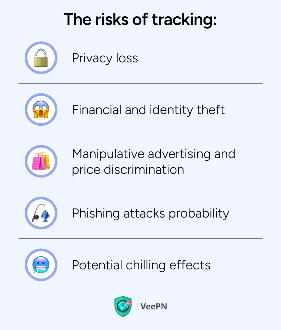 就像設備指紋識別一樣,您的網絡瀏覽器也會受到詳細的分析。您訪問的網站、您用谷歌搜索的內容、您上網衝浪的時間等等都會創建廣告商、公司和政府可以訪問的獨特的在線個人資料。但如果這些信息洩露給騙子怎麼辦?網絡釣魚嘗試、帳戶洩露或身份盜竊是瀏覽器跟踪最明顯的缺點。