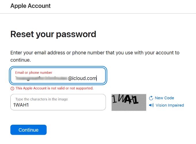 當你前往iforgot.apple.com,輸入您的 Apple ID,解決驗證碼,然後單擊繼續,您將看到相同的消息,而不是被允許驗證: