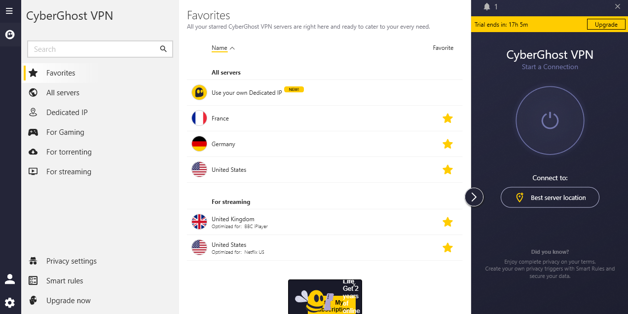 Cyberghost應用程序包含針對Windows和Android用戶的拆分隧道功能。這些也是用於遊戲,流媒體或洪流的專門服務器。