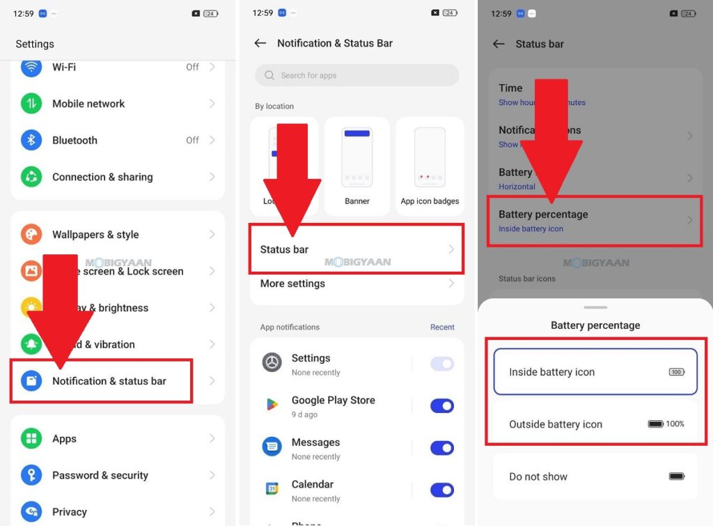 - 要查看狀態欄中的電池百分比,只需轉到設置 -> 通知和狀態欄 -> 狀態欄 -> 電池百分比並選擇所需的選項。
