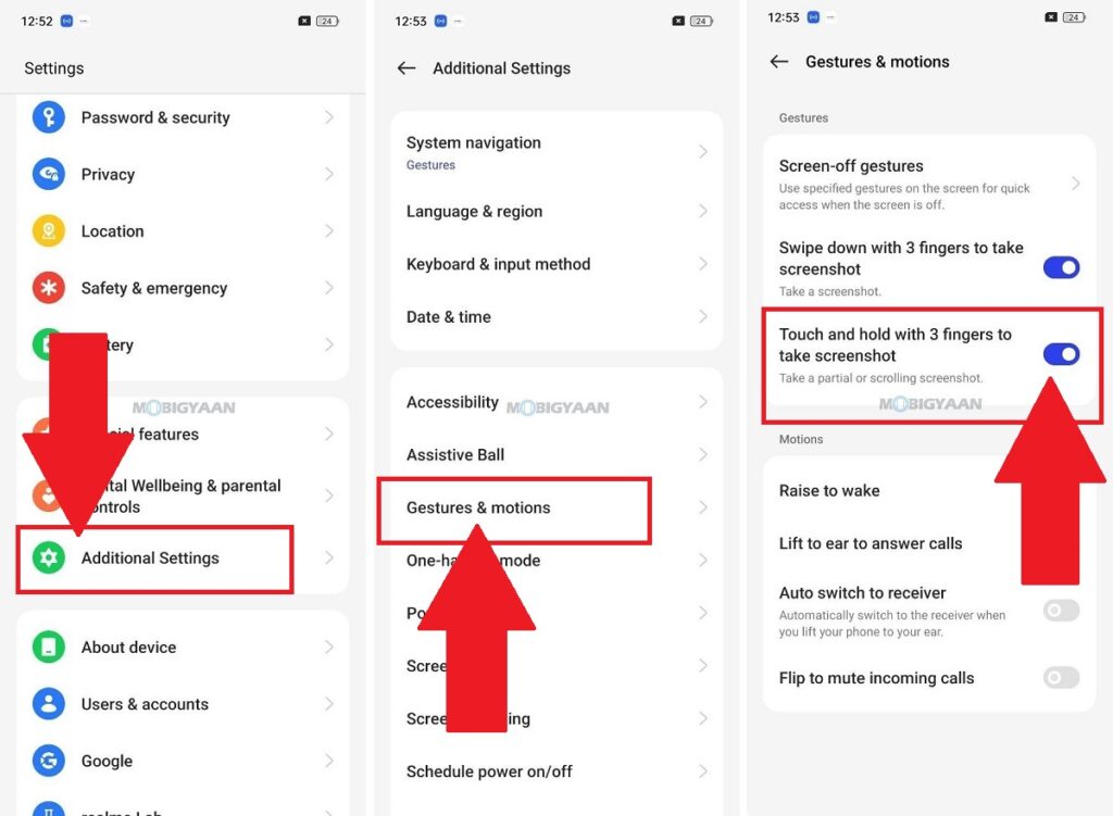 - 前往設定->系統設置->手勢和動作並打開滑塊三指長按即可截屏。這將啟用三指屏幕截圖以及部分屏幕截圖手勢。