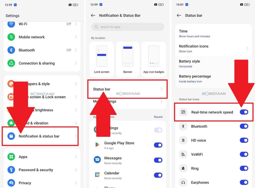- 前往設置 -> 通知和狀態欄 -> 狀態欄並根據狀態欄圖標部分,點擊實時網速打開滑塊。