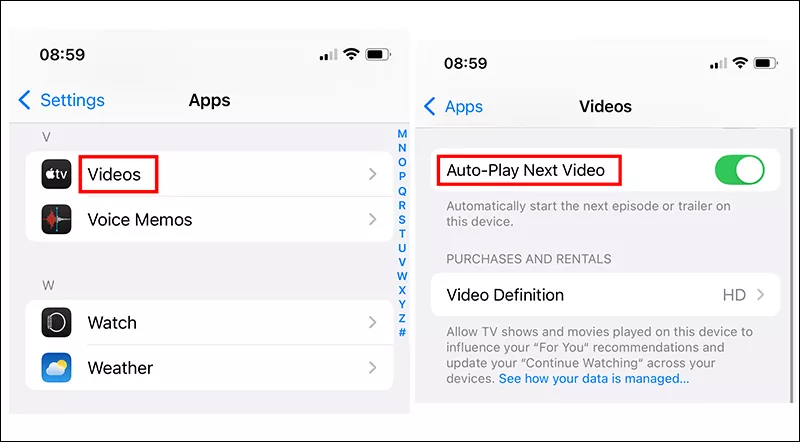 要在 Apple TV 中啟用自動播放下一個視頻,請前往“設置”->“應用程序”->“視頻”。找到自動播放下一個視頻選項,然後將其打開。
