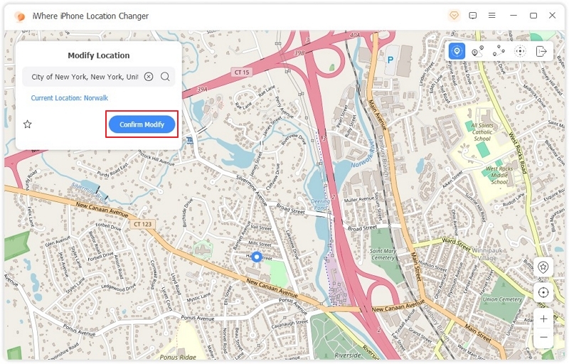 步驟5:導航到左上角,然後在“搜索框”中鍵入所需的“目標”。然後,單擊“確認修改”以更改“查找我的iPhone”的位置,而無需通知。