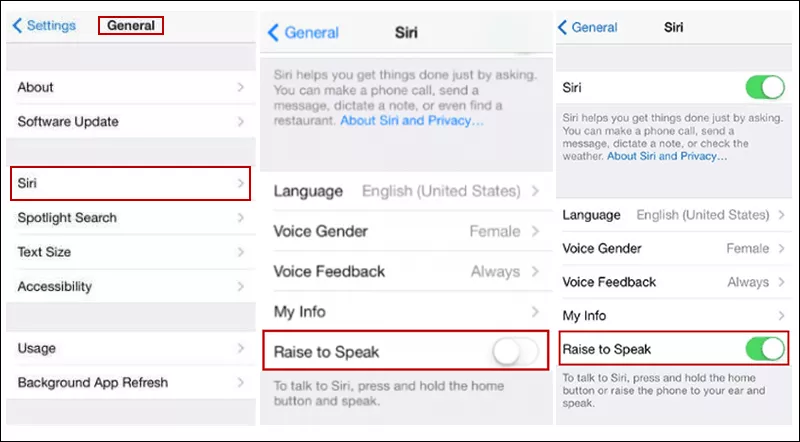 步驟:如果您對舊版 iPhone 抱有幻想,請訪問設定>一般的>西里。在這裡你可以開啟舉起 iPhone 說話選項。