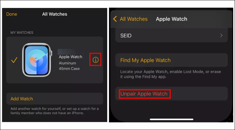 步驟一:打開 iPhone 上的 Watch 應用,點擊“所有手錶”,然後點擊資訊手錶旁邊的圖標。點擊取消配對 Apple Watch並確認。
