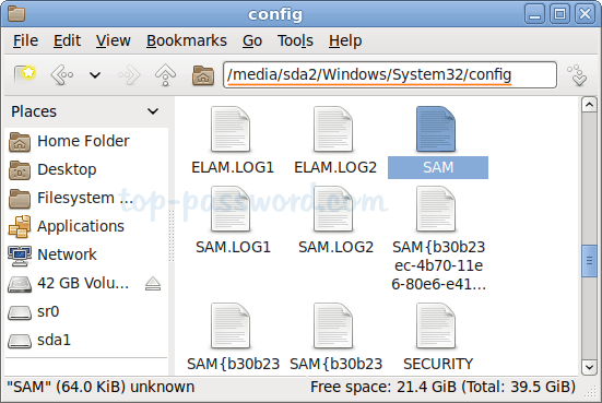 當您到達 Knoppix 桌面時,使用內置文件管理器查找位於 /Windows/System32/config 下的 SAM 文件。記下 SAM 文件的完整路徑。