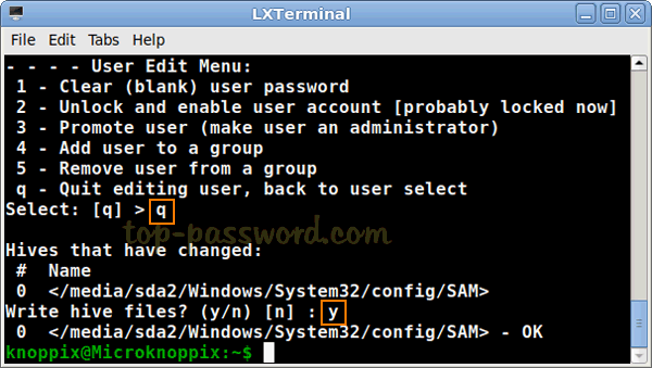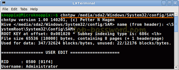 現在,通過運行內置實用程序 chntpw 加載 SAM 文件。
