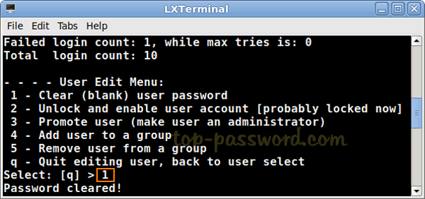 要重置 Windows 本地管理員密碼,請鍵入1並按 Enter 鍵。您將看到消息“密碼已清除!”