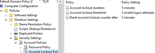 通常,用戶鎖定設置在Default Domain PolicyGPO(配置->Windows 設置->安全 設置->賬戶 政策->賬戶 閉鎖 政策)。有以下三種選擇: