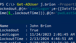 Get-ADUser j.brion -Properties Name,Lockedout, lastLogonTimestamp,lockoutTime,pwdLastSet | Select-Object Name, Lockedout,@{n='LastLogon';e={[DateTime]::FromFileTime($_.lastLogonTimestamp)}},@{n='lockoutTime';e={[DateTime]::FromFileTime($_.lockoutTime)}},@{n='pwdLastSet';e={[DateTime]::FromFileTime($_.pwdLastSet)}}