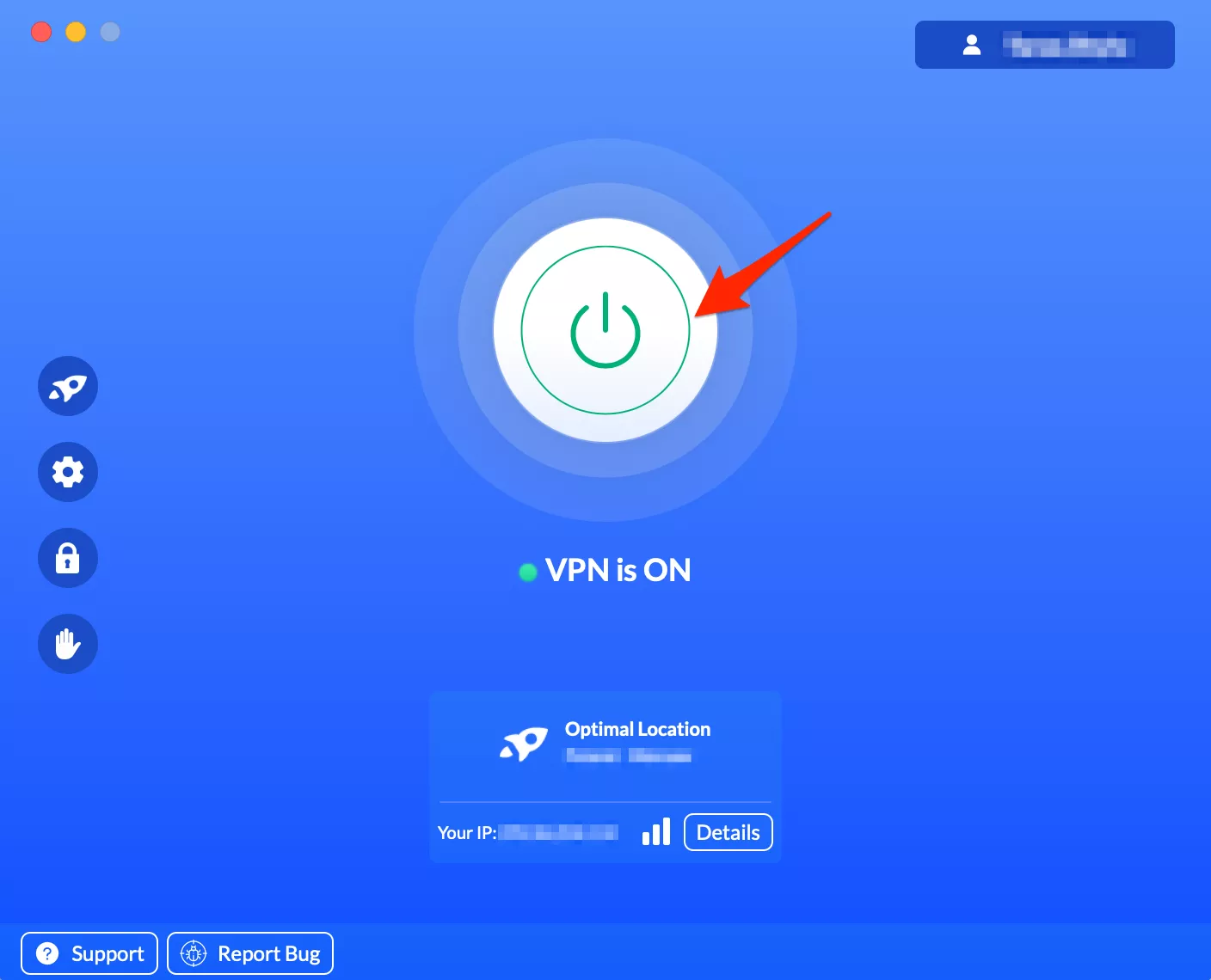- 連接到服務器。打開應用程序並從全球 60 個國家/地區的 89 個選項中選擇首選服務器位置。一旦您連接到服務器,您的真實 IP 將被替換為匿名地址。請注意,為了獲得最佳性能,您可以使用最佳位置該功能會自動將您連接到附近最快的 VPN 服務器。