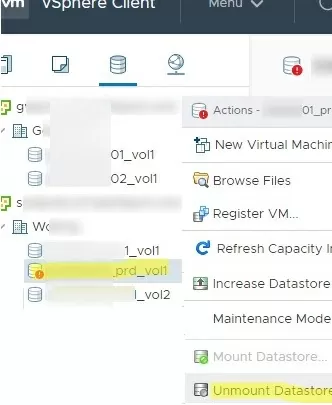 如果 NFS 共享在 ESXi 上卸載之前已在 NFS 服務器端禁用,或者 NFS 卷上仍有虛擬機正在運行,則當您嘗試從 vSphere Client 界面卸載 NFS 數據存儲時,會出現錯誤: