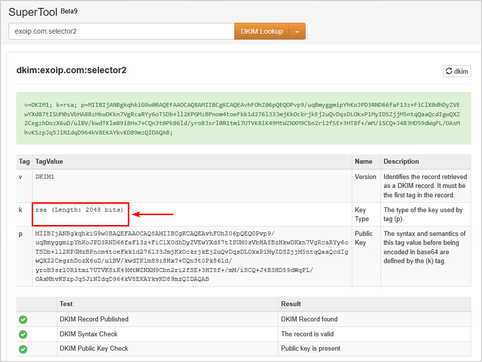 選擇器 2 有一個2048 位DKIM 密鑰。