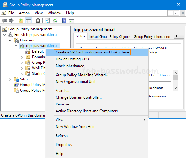 - 現在,在小組政策管理的左窗格中,右鍵單擊您的廣告域,然後選擇“在此域中創建GPO,然後在此處鏈接…”菜單。