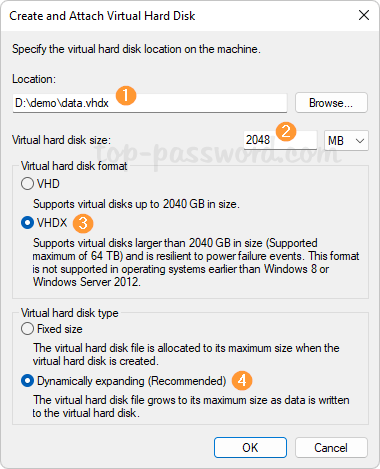 顯示該磁盤上存在的所有捲。您需要知道要存儲 VHD 文件的驅動器號。create vdisk file=c:\win8.vhd maximum=10000 type=expandable