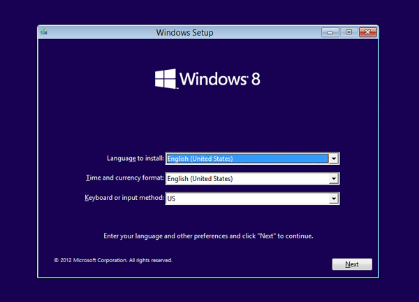 - 幾分鐘後,您將看到 Windows 設置屏幕。選擇一種語言(默認為美國英語),然後單擊“下一步”。